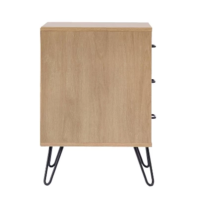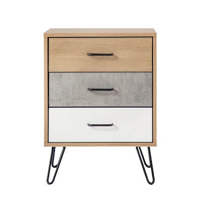 A perfect blend of contemporary style and sophistication, this nightstand is guaranteed to bring an elegant charm to your interior settings. It has three spacious and smooth gliding drawers that are ideal for keeping your nighttime essentials safely organized. The wide rectangular top can be used as a convenient space for a phone charger, lamp etc. Handcrafted with tricolor drawers in subtle oak brown, gray, and white finish, and supported on black metal hairpin legs, this piece is as functional and reliable as it is visually pleasing. Check out our Harper collection for matching items.
