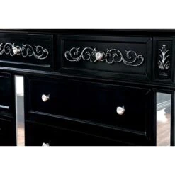 Enchant every guest with this eye-catching two-piece nightstand and dresser set. The dresser is crafted into a masterpiece with its six spacious drawers, injecting a hint of drama to your space with mirrored paneling and crystal-like hardware. The drawer panels flaunt sweet swirl designs that can’t be overlooked, while the same pattern is duplicated on the matching three-drawer nightstand.