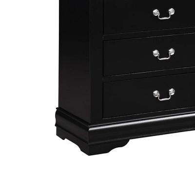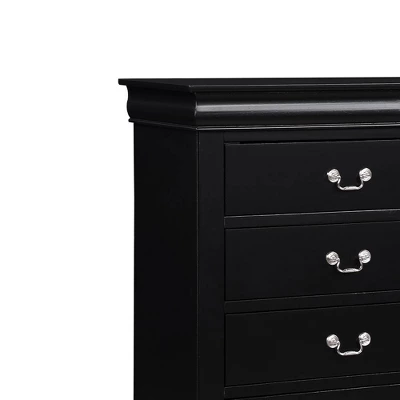 Bring casual elegance into your home with the Louis Phillipe bedroom collection. The Louis Philippe Chest in black finish is equipped with brushed nickel metal hardware that lends antique elegance. Store bedding, clothing, and more in the five roomy drawers. Choose from available finish options to best coordinate with existing bedroom furniture. This five drawers chest offers any bedroom a sophisticated look. Finished in classic finish with metal hardware, the simple moldings and luxurious pull handles add subtle style and appealing detail to each piece.