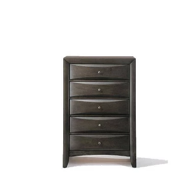 The Ireland chest in black finish with 5 spacious drawers will meet all of your bedroom storage needs, with space for clothing and linen. All drawers have English dovetail with center metal glides. Drawer fronts are beveled. Complemented by slightly flared square legs, the Ireland collection features contemporary feel and a modern black finish with shaped drawer fronts. Selected solid wood and engineered wood construct the frame, topped by wood veneers. The drawer faces boast beveled tops and bottoms, equipped with a nickel-finished metal knob.