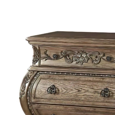 Elevate your living room, bedroom, or home office with this vintage-inspired nightstand. The Ragenardus nightstand is an impeccable example of truly memorable luxurious traditional design. This three-drawer vintage oak nightstand features a detailed French style front and English back in a stunning Bombay shape case, Felt-Lined top drawer, side metal glides, scrolled legs and antique pull-ring handles. The ample storage case pieces, beveled mirror, top felt lined drawers, and metal glide makes this set truly elegant and will be a great addition to your home.