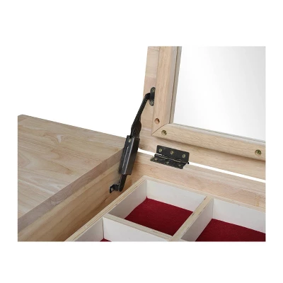 For those who appreciate high quality wood furniture with a traditional and elegant look. International Concepts home furnishings will complement any decor. This Vanity Table and Bench is made of solid hardwood with a butcher block surface offering years of use. The vanity measures 40.2″ W x 17.1″ D x 31.5″ H. It features a flip up mirror and felt-lined drawers on Euroglides for easy open and close. The mirror measures 13.2″ x 13.2″. The inside drawer dimensions are 13″ W x 7.9″ D x 1.6″ H. A removable storage box has 6 compartments, each measuring 4.7″ W x 4.3″ D x 1.6″ H. The bench features a soft and comfortable microfiber upholstered seat. It measures 17.5″ W x 13.2″ D x 18.1″ H. The set is unfinished, allowing you to match any decor, and ships ready to assemble.