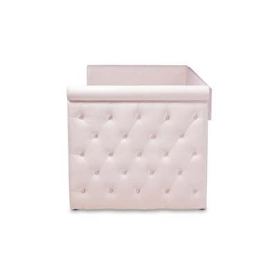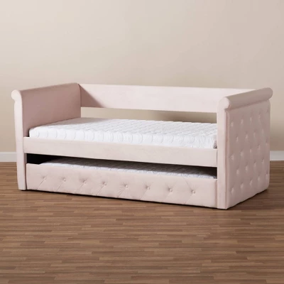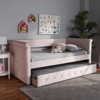 Utilize your space more efficiently with the elegant Amaya daybed. This versatile piece is fitted with a pull-out trundle to provide convenient accommodation for overnight guests. Constructed from engineered wood, the Amaya is padded with foam and upholstered in a soft, sumptuous velvet fabric that provides ample comfort for you to lean against. Scrolled arms and button tufting give this daybed a chic, refined look. Add a few throw pillows and a cozy duvet to complete the look. The Amaya daybed is made in Malaysia and requires assembly. Dimensions: 37.48″ High x 86.22″ Wide x 57.09″ Deep; Arms: 37.48″ High x 57.09″ Wide x 3.54″ Thick; Side rail: 6.1″ High x 76.77″ Long x 0.79″ Thick; Top Slats: 1.77″ Wide x 55″ Long x 0.71″ Thick; Height from Floor to Top of Side Panel: 37.48″ High; Trundle: 9.65″ High x 75.98″ Wide x 40.35″ Deep; Bottom Front Trundle Panel: 9.65″ High x 75.98″ Long x 1.18″ Thick; Trundle Slats: 1.77″ Wide x 39.25″ Long x 0.71″ Thick; Inside Dimensions (Mattress Size): 54″ Wide x 74″ Deep