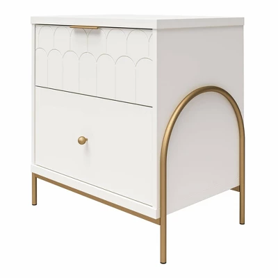 Say hello to the fun and *very* flirty Anastasia Collection from CosmoLiving by Cosmopolitan. Because yes, you need this in your life! Bursting with personality, this refreshing collection features creamy white finishes with playful scalloped details accented by brassy gold hardware and curvaceous rounded metal legs. The Anastasia Nightstand is the perfect bedside companion, with two roomy drawers to keep all your nocturnal essentials within arms reach. Did we mention, the ultra-durable MDF and powder-coated steel construction of this Nightstand can stand the test of time without depleting your bank account? Treat yourself to this and many more on-point pieces from CosmoLiving by Cosmopolitan for a fiercely coordinated look. (each sold separately)