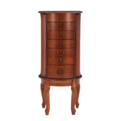 This petite Jewelry Armoire is sized for economy and function. Features an Ebony Black finish with flip top and inset mirror, scalloped skirt, and spindle turned legs. The top compartment is divided with half ring pads, half two squares. There are side swing doors with fully lined interior compartment and one row each of five chain necklace hooks and matching rayon cord. There are three small and two large drawers. The first drawer has six squares and the second has four. The third, fourth and fifth drawers are open and fully lined. Lining is plush black, 100% rayon. Top and leg assembly.