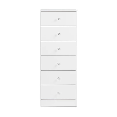 This Astrid 6-Drawer Tall Chest with Crystal Knobs is your small space bedroom solution. It’s contemporary design and clean lines will complement any decor. Profiled drawer fronts and acrylic crystal knobs add a beautifying touch. Use on its own or pair it with other matching pieces from the Astrid Collection.