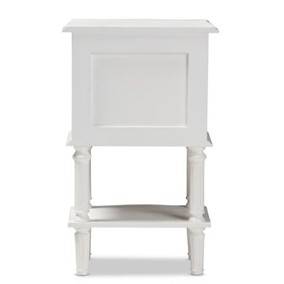 The Audrey 2-drawer nightstand has the clean, crisp look you’ve been searching for. The country cottage farmhouse-inspired design emphasizes smooth lines and bucolic details. The Audrey’s sturdy frame is finished all over in white, mathis piece dynamic and easy to coordinate with a wide range of looks, including French and rustic styles. The nightstand features two convenient drawers for additional storage at your bedside, as well as an open shelf space. The drawer knobs of the Audrey have a charming design, and are finished in bronze. The gently curved face of the nightstand complements the carved, contoured look of the piece’s top and ball-turned legs. Breathe new life into your bedroom or guest room with the Audrey nightstand. Made in Indonesia, the nightstand requires assembly. Dimensions: 25.59″ High x 15.75″ Wide x 11.81″ Deep; Drawers: 4.33″ High x 9.84″ Wide x 9.25″ Deep; Shelf: 10.94″ High x 14.57″ Wide x 10.43″ Deep: Legs: 4.96″ High