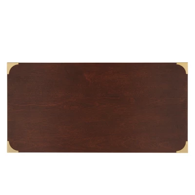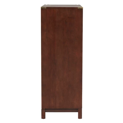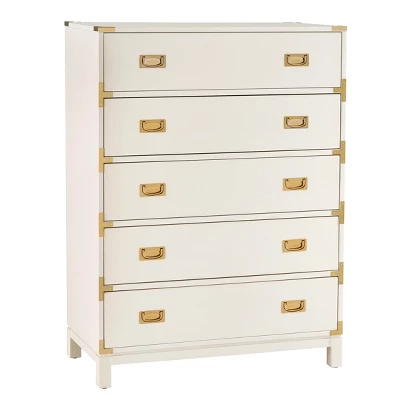 The Borden Campaign 5-Drawer Chest from Inspire Q is just the boost your room needs. This wood dresser has five drawers that are great for storing clothes and other belongings, and the natural finish is always easy to incorporate into your home. This five-drawer dresser has gold handles and embellishments that give it style and character, so be sure to add other gold accent pieces throughout the room to complete the look.