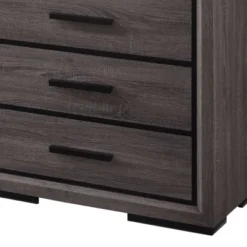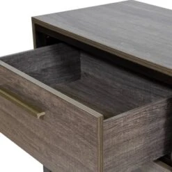 The modest design of this distressed walnut nightstand makes it perfect for a farmhouse style guestroom. Its minimalist frame presents a simple tabletop and perfect legs. Though neat in structure, the natural wood grain detail offers a liveliness. Tuck this table bedside, at the end of a sofa, or in your home office. The smooth bronze knobs accenting the drawers on ball bearing glides are quiet features.