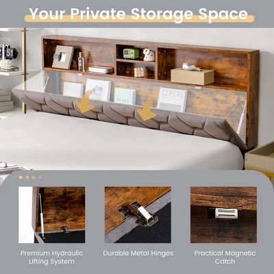 - Multifunctional Storage Headboard: The platform bed frame features a multifunctional storage headboard, which consists of 4 open compartments and a hidden space, making up your private storage space for alarm clocks, books, eyeglasses, etc. In addition, fitted with premium hydraulic lifting system, it is safe, smooth and quiet to open the headboard lid.