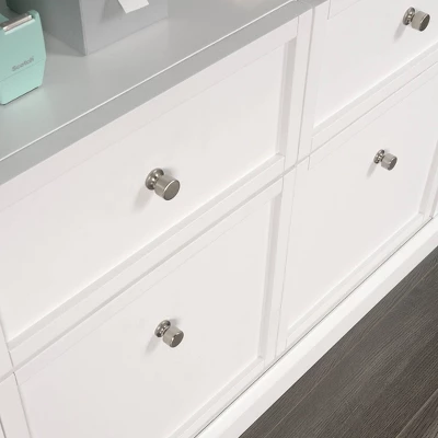 Scrapbook paper, scissors, and stamps – store it all in this storage cabinet from the Craft Pro Series. It features four easy gliding drawers with full extension slides and an open shelf for easy access storage of all your crafting materials. It also includes a melamine top surface that is resistant to heat, stains, and scratches. Finished in White, this sleek storage cabinet is the perfect solution to all your storage needs.