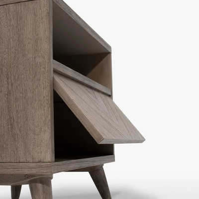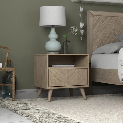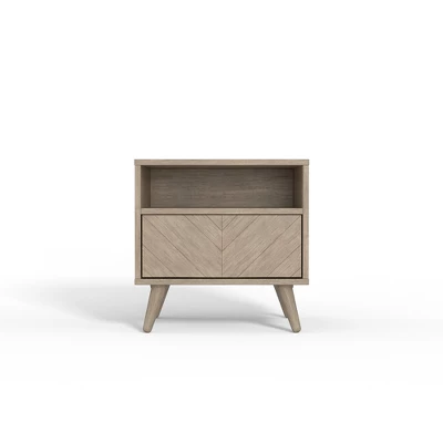 Display, store, and organize your bedtime essentials with this modern, mid-century nightstand. It features a snap drawer to stow belongings out of sight. It also features a top shelf and an inner shelf for easy-access storage. This end table is crafted from solid mahogany and mindi wood with minimal MDF made from recycled resin and wood fibers. It’s easy to assemble, and the stylish chevron pattern will work with any bed frame.