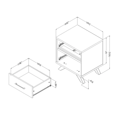 A night stand with character Here’s a piece they’re sure to notice! With angled wooden legs for an original touch and a decorative molding for contrast, this Modern style night stand will look quite elegant next to your bed. A versatile Scandinavian style Whatever decor you choose for your bedroom, this night stand from the Flam collection will add a touch of Scandinavian chic. Create a warm, laid back atmosphere – a place to sleep or just relax. This piece will blend easily with pastel colors and a minimalist interior. Keep it simple – that’s the key! Storage space This small night stand has two drawers on metal slides for storing whatever you keep by your bed: magazines, reading glasses, a box of tissues, your phone and mobile devices. The drawers, which feature elegant metal knobs and straight handles, open and close smoothly, to allow you easy access to your things. Each drawer can hold up to 25 pounds. Keep the space around your bed neat and tidy! 5-year limited guarantee South Shore is proud to stand behind this 2-drawer nightstand – end table with storage with an exclusive 5-year limited guarantee. Shop with confidence knowing your purchase is always covered. All our products meets or exceeds North American safety standards and our packaging are tested and certified to reduce the risk of damage during shipment. This item is shipped in 1 box, make sure to have a friend with you. Assembly is required by 2 adults and tools are not included. If you have questions regarding this product or need assistance do not hesitate to contact South Shore Furniture 7 days support. You can reach customer support by phone at 1.800.290.0465 or you may chat with an agent live at: southshorefurniture Website. This product is made in North America with laminated particleboard. Accessories not included.