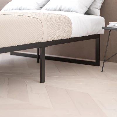 Polish the look of your bedroom or guest room with the sophisticated, artisan design of this black textured finish full metal platform bed frame. The lack of a headboard and footboard will streamline a modern bedroom but will also give the illusion of an open, airy space in a small room and making the bed is infinitely easier with no obstacles in the way. If you like to change the layout of your room often, this metal full bed frame is easily moved making redecorating a breeze. Best of all, the 12.5 inches of clearance under the frame allows for generous underbed storage and easy access for cleaning. If you’re looking for a solid, stable metal bed frame that can last for years without breaking down you’ve come to the right place. This platform bed frame is constructed from 19 gauge solid steel reinforced with metal screw construction and holds up to 650 pounds to accommodate most users. Solid steel slats stay in place to prevent sagging helping to increase the lifetime of your mattress. This metal platform bed frame will support your memory foam, latex or traditional innerspring mattress with no need for a box spring. Felt pads between the middle rail and support slats reduce noise for a peaceful nights sleep while adhesive strips prevent your mattress from moving. Fixed plastic floor glides will prevent damage to your flooring. In case of spills or dust build up, simply clean with a damp cloth. Easily assembled, this full size metal platform bed frame will be ready to go in 30 minutes or less with the included tools for quick use. Pair this metal frame with our 12 Inch CertiPur-US Certified Foam and Pocket Spring Mattress to complete your setup and get an excellent nights sleep. Additional Features: Felt Pads between the middle rail and support slats for noise reduction, Clean with a Damp Cloth to remove spills or dust, Assembles in Less Than 30 Minutes with Included Tools for quick setup, Mattress Support ideal for any bedroom or guest room and blends with any décor