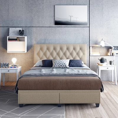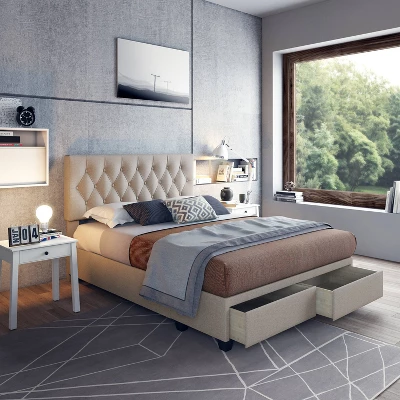 Timeless and functional, this upholstered storage platform bed provides 2 large storage drawers to help keep your space organized. Euro side glides on the drawers ensure smooth opens every time. The headboard features classic button-tufting and the bed is completely upholstered and slightly padded for a premium look and feel.