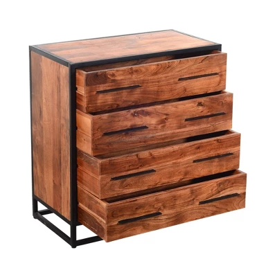 Add this spacious Dresser in your bedroom or dressing room setting to create a clutter free storage space, featuring black powder coated metal and rustic brown acacia wood blend construction that gives it an industrial appeal. Showcases natural wood grain and knot details, this dresser features 4 spacious drawers that are facilitated with metal bar handles for easy access while a tubular metal base comes with floor protectors.