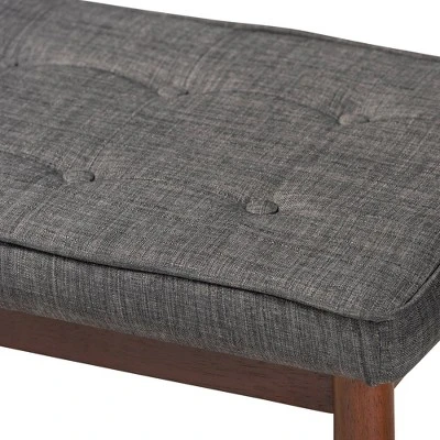 Transform your dining room with the elegance and comfort of the Itami dining bench. Constructed from solid rubberwood, the Itami showcases a stunning medium oak finish that complements the gray fabric upholstered seat. The seat features button tufting and piping trim for a touch of refinement. Mid-century modern design inspiration is evident in the low profile and angled, tapered legs. This versatile piece works well as seating at a dining table, or can be used as an accent piece in the entryway. The Itami bench is made in Malaysia and requires assembly.