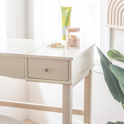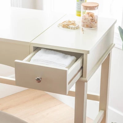 The Cream Jackson Vanity Set is perfect for providing storage and grooming space in a large bathroom or bedroom. The spacious top features a flip top that has a hidden mirror and open storage area. Two storage drawers are accented with small round pulls and provide ample hidden storage space. The cream finish and sleek design are ideal for any decor style.