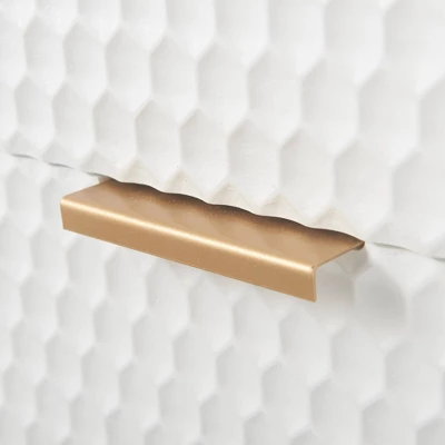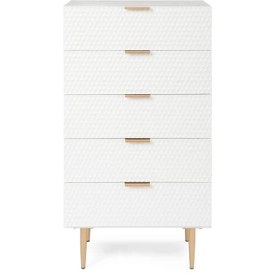 Make any space photo-worthy with this modern dresser. Whether paired with other bedroom furniture or as a stand-alone piece, this chest of drawers definitely draws the eye. It’s not only aesthetically pleasing but also highly functional, with five drawers that can hold clothes and bedding. The clean lines and detailed touches of this stylish dresser, such as the honeycomb texture and gold metal accents, allow it to seamlessly mesh into any type of contemporary decor. You’ll have a furniture staple for years to come with this piece that was built to last using metal leg supports and medium-density fiberboard to allow it to stand up to normal wear and tear.