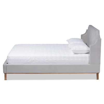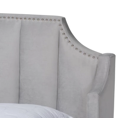 With its wingback headboard and soft velvet upholstery, the Adelie bed strikes the right balance between glam and cozy. Constructed from wood, the Adelie is upholstered in a sleek, sumptuous light gray velvet fabric that provides comfort for you to lean against. Channel tufting on the headboard highlights the stunning tones in the velvet, while silver metal nailheads accentuate the elegant wingback design. The platform is finished in a warm walnut brown and supported by a set of angled, tapered legs for a touch of retro charm. The Adelie bed is made in Malaysia and requires assembly. Dimensions: 44.69″ high x 87.4″ wide x 83.07″ deep; Headboard: 77.95″ wide x 25.98″ long x 4.92″ thick; Distance between slats: 4.53″; Height from floor to top of slat: 13.58″ high; Legs: 5.91″ high; Inside dimensions (mattress size): 76″ wide x 80″ deep