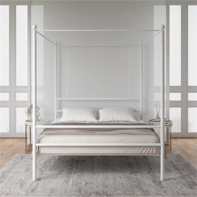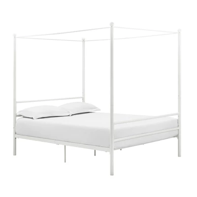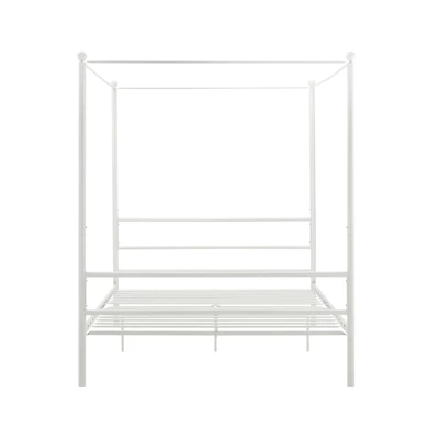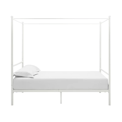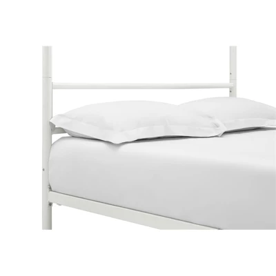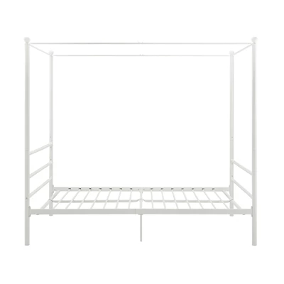 The DHP Kora Metal Canopy Bed is made with a classic and practical four-post frame. The Kora features a stunning frame with a stylish design to easily match any bedroom or guestroom. Its simple headboard and footboard design are made with strong metal and its slat support system provides adequate support for your mattress – no additional foundation or boxspring required. The slat system allows air to pass freely under the mattress to maximize freshness. Finish the look of this stunning frame and get ready to sleep the night away by adding your favorite mattress, fun accent pillows, and bedding to match. Available in three colors, and shipped in one box for an easy assembly, this bed will suit everyone’s needs.Features : Four-post canopy bed with a modern design and finial detailingSturdy construction that includes metal slats without needing a box spring. Metal slat base allows air to pass freely beneath your bed, keeping your mattress fresher longerIncludes a metal center rail and additional legs for added support and comfortAvailable in black, white and gold metal, in twin, full land queen sizesShips in one box and assembles easilyFull size dimensions: 78″L x 56.5″W x 75″H. Weight limit: 450 lb.Full size shipping dimensions: 59.5″L x 20″W x 4″HSpecifications : Product Dimensions : 75 H x 78 W x 56.5 DProduct Weight : 62Weight Capacity : 450