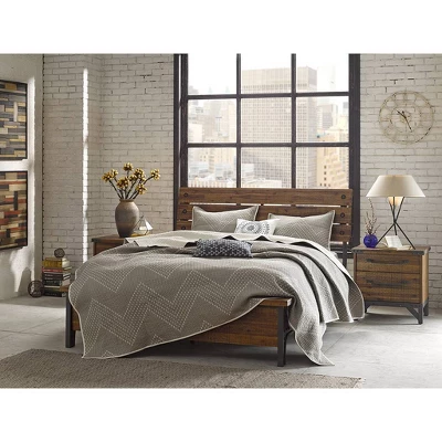 Restyle your bedroom with the bold industrial look of the Lancaster Nightstand. This nightstand table features a solid wood frame in warm amber wood finish with graphite metal accents to create a warm industrial look. The metal legs also showcase a graphite metal finish and provides sturdy base. The 2 drawers easily open with the heavy full-extension metal glides and provide plenty of storage space for your bedside essentials. Leg assembly is required.