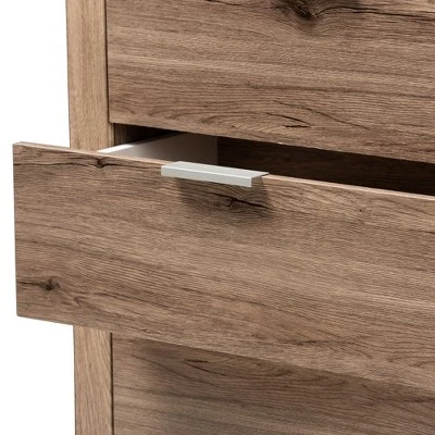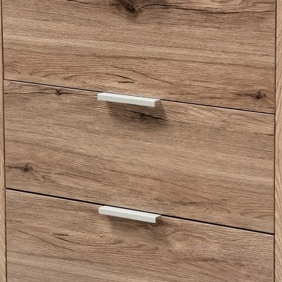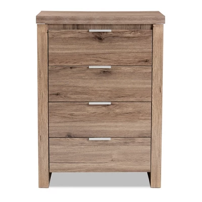 The Laverne 4-drawer chest is an essential piece of furniture that is both charming and simple. The modern and contemporary-inspired design is exemplified in the rectangular, geometric silhouette. The Laverne is finished in a natural oak to give you a hint of rustic and natural vibes. The chest features convenient top side drawer pulls on each of the four drawers, which roll out smoothly on slides. The minimalist chest, with its neutral coloring, will be easy to coordinate with the decor in your bedroom or guest room. The Laverne can even serve as additional storage in your entryway, living room, or closet. Made in Malaysia, the chest requires assembly. Dimensions: 38.19″ High x 27.56″ Wide x 15.75″ Deep