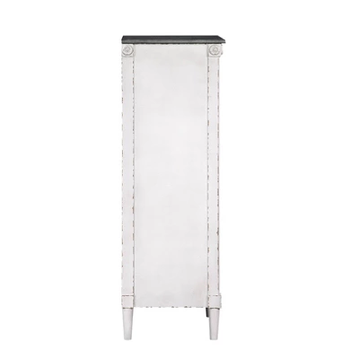 Keep your jewelry organized and in 1 place with this rustic jewelry armoire chest. Crafted of solid wood in a crisp, distressed antique white finish and antique gray, this jewelry armoire strikes a tall rectangular silhouette with carved details and clear ring knob pulls. Lift-top reveals hidden mirror and soft velvet area to store memorable jewelry, while 4 spacious front drawers provide felt-lined storage for watches, brooches, and bracelets. This large standing jewelry armoire is sure to make all of your dreams come true. Designed with elegance and tradition in mind. This eco-friendly frame is constructed from rubberwood, a tropical, solid wood taken from rubber plantations.