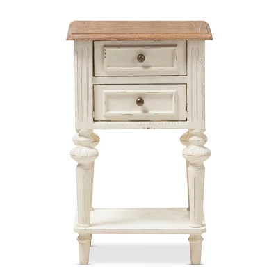 Traditional and contemporary elements work together in the Marquetterie French provincial style nightstand, giving it a timeless elegance. The gorgeous provincial design elements have been delicately restored and finished with a rustic iron handle, weathered oak wood top and distressed white polish. This bedside table with two drawers and one shelf works beautifully as a side table in the living, entry, hallway, in addition to the bedroom. The neat proportions of this bedside table make it a functional piece for smaller spaces. The meticulously carved French fluted legs and corners and the frame details are paired beautifully with a classics white distressed finish, giving a traditional style table a chic twist. Classical and functional, the Marquetterie nightstand is made in Indonesia. It requires assembly.