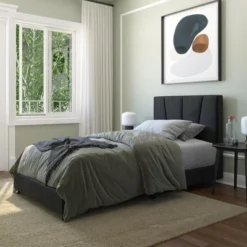 Elevate the look of your sleep space with the clean lines and a minimalist design of this wood platform bed. Comprised of solid wood with an MDF veneer, this platform bed is designed for many years of use and holds up to 500 lbs. static weight. Adjustable floor glides ensure a level sleeping surface and protect your hard indoor flooring surfaces. Supportive wood slats are designed to hold any mattress with no box spring required and all tools and hardware are included for quick and easy assembly.