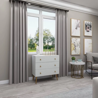 Useful and elegant, cabinets are more than just a place to store clutter and place a lamp. Add a unique stylish storage to your living room, hallway, or bedroom with this cabinet. This accent furniture serves both decorative and functional purposes and is best to display in modern-themed entryway, lobby, living room, reading room, or bedroom. Designed with rubber stoppers at the base that prevent scratching as well as sliding around. This item comes shipped in 1 carton. This white rectangular cabinet features 3 drawers with 28.25″L x 13.37″W x 5.50″H measurements. Suitable for indoor use only. Some assembly required. Maximum weight limit is 100 lbs. Modern Design.