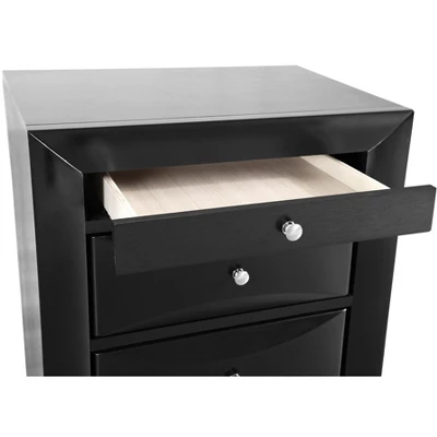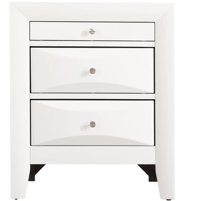 Assembled nightstand is finished in real Wood veneers over manufactured and solid wood. Drawers move on center supported metal guides and are dovetailed front and back. Corner blocks are utilized to support drawer bottoms. Choose from a variety of colors. Additional case pieces are available as well as matching beds.