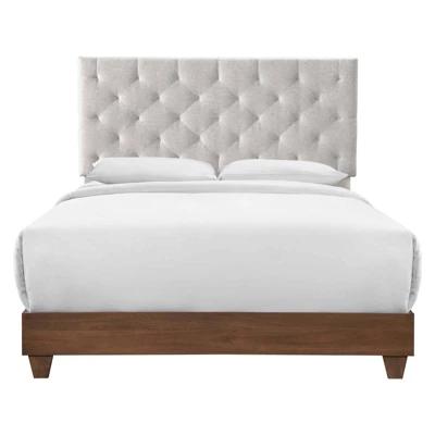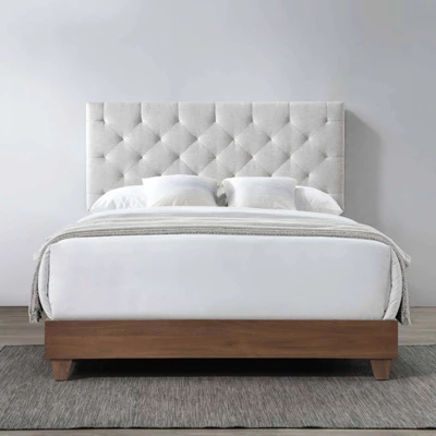 Manifest the extraordinary in your bedroom decor with the Rhiannon Diamond Tufted Upholstered Fabric Queen Bed. Solidly constructed from MDF and wood, Rhiannon Queen Bed has tapered legs and a walnut veneer. Rhiannon’s sturdy frame comes with dual support planks, soft and durable polyester fabric upholstery, and a padded tufted diamond pattern headboard, for enhanced comfort and stability. Claim the elegance of Rhiannon Queen Bed for your master suite or guest room. This queen panel bed has a fixed position headboard, requires assembly and box spring. Headboard included. Spot clean as needed. Bed Weight Capacity: 800 lbs.