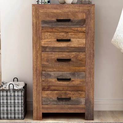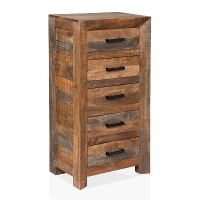 This simple yet stunning vertical chest pairs traditional beauty with rustic elements. The sawblade plank design enhances the solid mango wood construction and its rich finishing. Handcrafted details accentuate the natural and organic craftsmanship while metal handles add an industrial flair. Each drawer provides storage, opening smoothly at the tug of the black metal pulls.