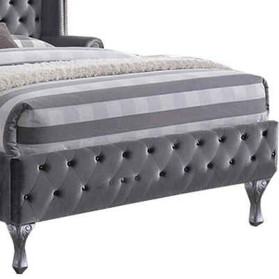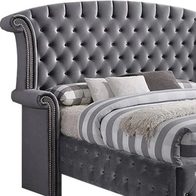 The Rebekah Queen Bed from Acme Furniture will have you feeling just like royalty when you add it to your home. This fabric-upholstered queen bed comes in light gray, and the tall arching headboard has a scrolled wingback design with low arms. Button tufting and nailhead trim add to the luxurious look, and the matching upholstered surround pulls the whole look together. Pair this elegant queen bed with neutral or light-colored bedding and a collection of throw pillows for a regal look you’ll love for years to come.