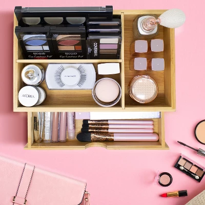 - BAMBOO ORGANIZER β Neatly stores makeup, toiletries, supplies, and more with divided compartments and drawer β Ideal for storage and display on any countertop