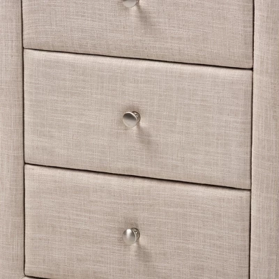 The Tessa 3-Drawer nightstand exemplifies how minimalism can be chic and sophisticated. The modern and contemporary-inspired design emphasizes clean lines and smooth surfaces. The Tessa features a foam-padded plywood and hardwood frame with all-over fabric upholstery. The chrome-finished drawer knobs provide a contrast to the upholstery as an additional style element. The Tessa also features three pull-out drawers on gliders, giving you more storage options at your bedside. The simplistic design makes this nightstand easy to coordinate with the existing decor in your bed room or guest room. Made in Malaysia, the Tessa requires assembly. Dimensions: 26.38″ High x 18.5″ Wide x 16.34″ Deep; Drawers: 5.71″ High x 12.83″ Wide x 12.83″ Deep