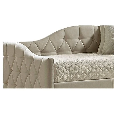 The Jamie Button-Tufted Daybed with Trundle by Hillsdale Furniture features a classic curved silhouette and that will pair nicely with your chic transitional decor. The daybed is upholstered in a beige linen fabric to give your bedroom a look of traditional elegance. The classic design comes in a space-saving package to add extra sleep space and style all at once. Includes trundle. Spot clean with a clean, damp cloth. Requires two standard twin size mattresses; not included. Some assembly required.
