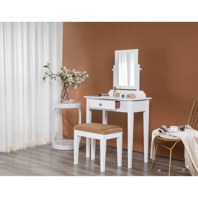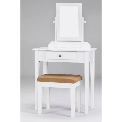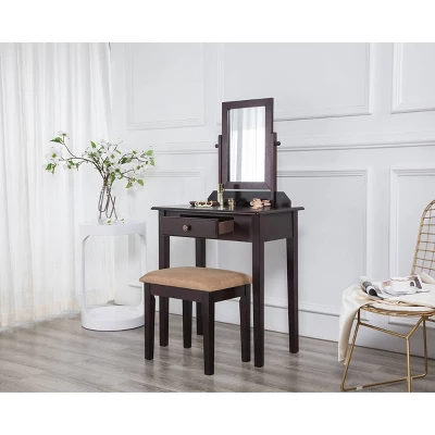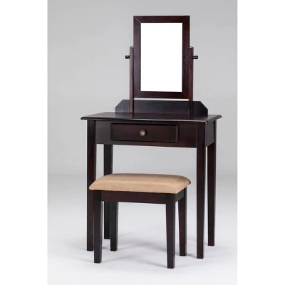 Start your morning routine in sleek style with the Vanity Set from Ore International. This elegant vanity set strikes a streamlined silhouette with a chic espresso finish for a timeless look. The tabletop surface is perfect for displaying makeup brushes, a vase of flowers or other accessories, while the middle drawer provides you with additional storage and organization for all your beauty essentials. A coordinating backless bench features a padded construction to keep you comfortable while perfecting your makeup routine, along with a tilting mirror for added convenience.