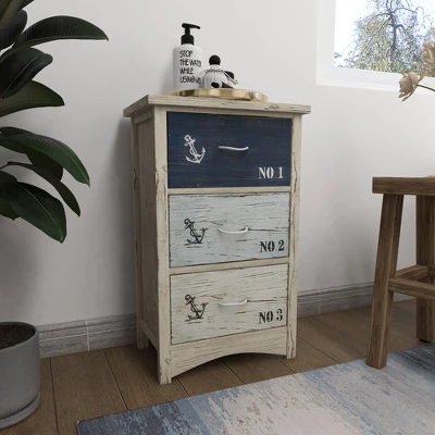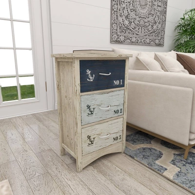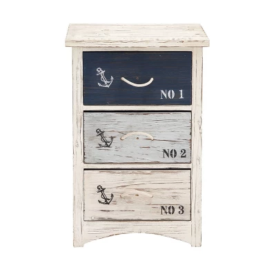 Beautifully crafted with durable structure and design for a long lasting enjoyment to keep your space free of clutter. A spacious piece of furniture that can instantly transform the look of any room in your home. Add this storage chest to any corner of your home space for an instant upgrade on your coastal-themed aesthetics. Includes anti-tipping hardware to prevent tipping. This item ships in 1 carton. White chest features 3 drawers with 15 lbs weight limit. Suitable for indoor use only. Maximum weight limit is 50 lbs. This is a single chest. Coastal style. Showcases stencil typographies in “NO. 1”, “NO. 2”, and “NO.3” on each drawer.