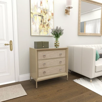 Beautifully crafted with durable structure and design for a long lasting enjoyment to keep your space free of clutter. A spacious piece of furniture that can instantly transform the look of any room in your home. Create an elegant display with this large upholstered dresser and decorate it with a metal object on top of books next to a large ceramic vase. This item ships in 1 carton. Beige chest features 3 drawers with 25 lbs weight limit. Suitable for indoor use only. Maximum weight limit is 25 lbs. This is a single chest. Glam style.